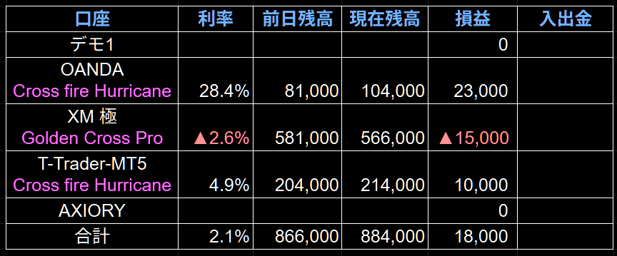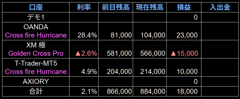 XMのゴールデンクロスが損切りを食らったが、そんなのは想定内だ。 そこをOANDAとスリートレーダーの『Crossfire Hurricane』が完璧にカバーし、トータルできっちり1.8万円のプラスを積み上げたぜ。