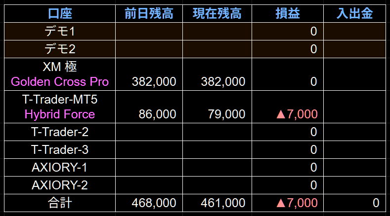 - 7,000円の損失で済んだのは、EAがリスクを限定してくれたおかげだ。先日の24,000円の利益が、この損失を遥かにカバーしている。